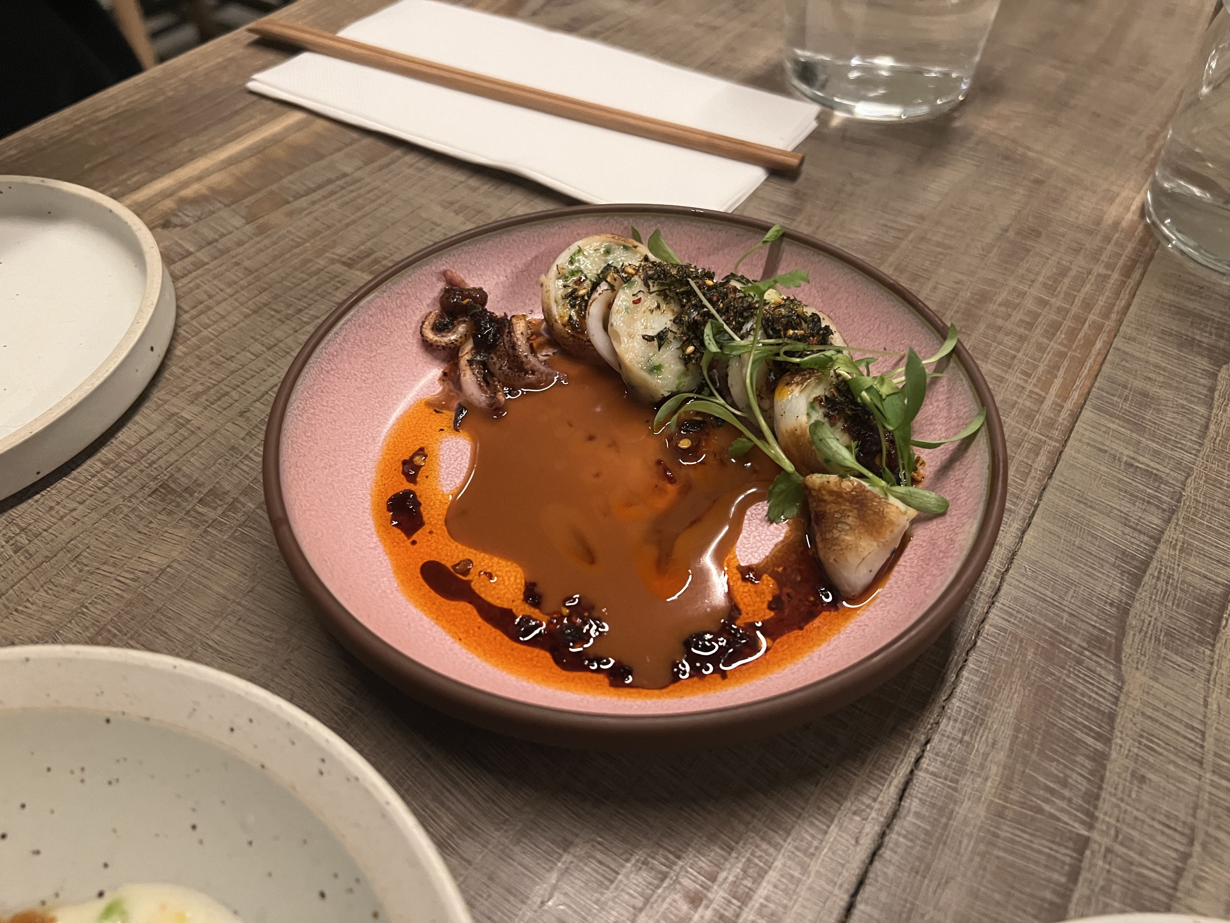 Next up was a warm dish course - we got the squid and the sweet shrimp.